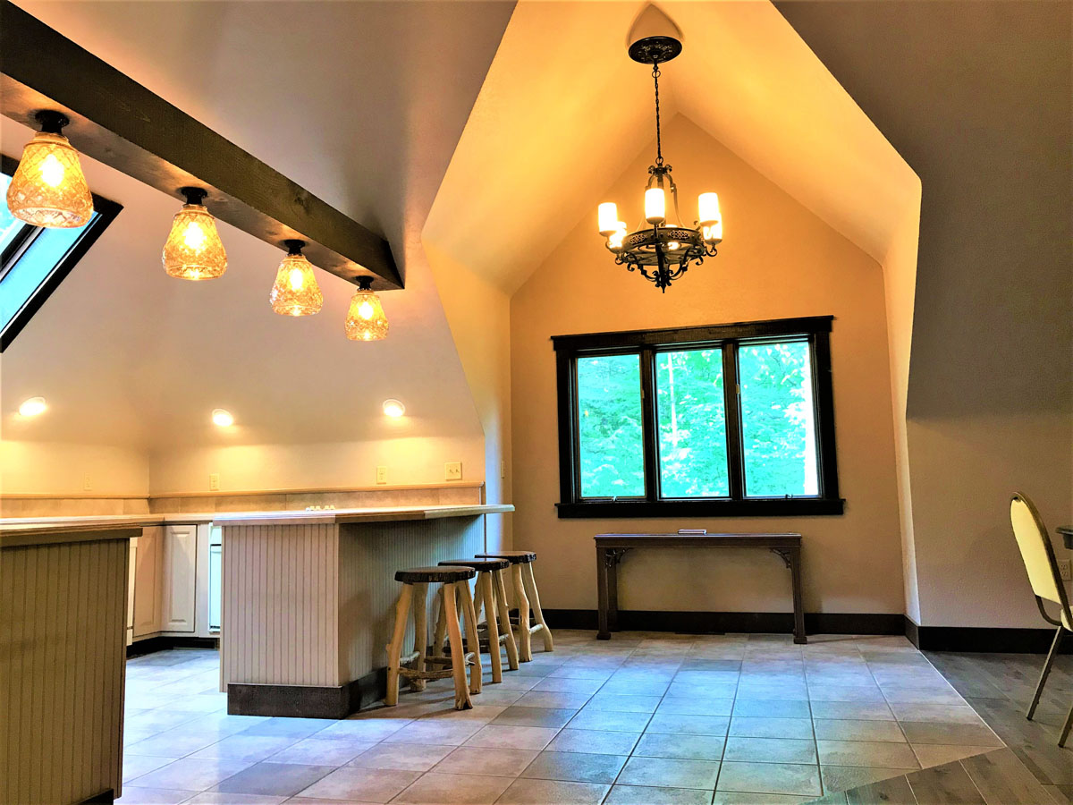 The SPACIOUS GRAND ROOM has a full-size kitchen with counter seating, a dining area with table & chairs, reclining motorized leather sofas, 65" HDTV, and high vaulted ceilings throughout.